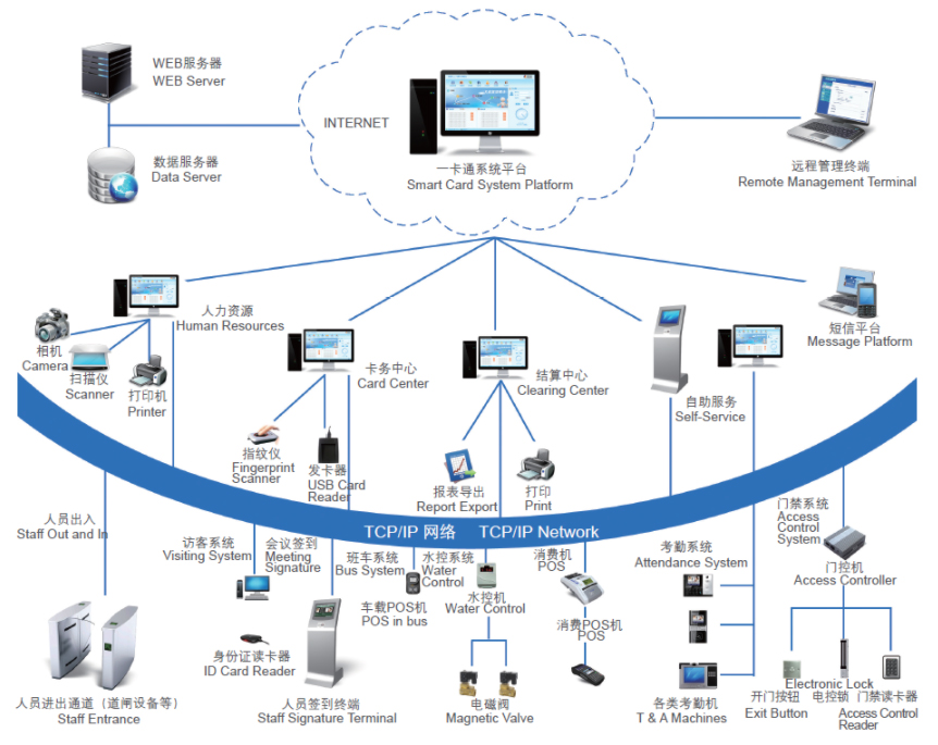 系統(tǒng)以一卡通管理系統(tǒng)為核心,通過網(wǎng)絡(luò)連接各功能模塊構(gòu)成系統(tǒng)的基本框架,由于系統(tǒng)按模塊設(shè)計,可根據(jù)管理和發(fā)展的需要量體裁衣,分步實施,任意增減功能和擴(kuò)充規(guī)模。